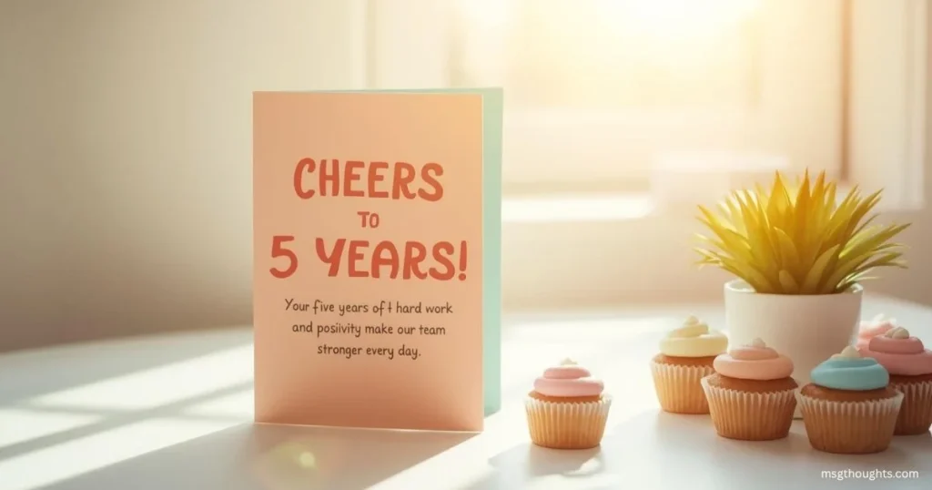 - “Cheers to your 5th work anniversary! Your journey has been inspiring, and your contributions invaluable.”